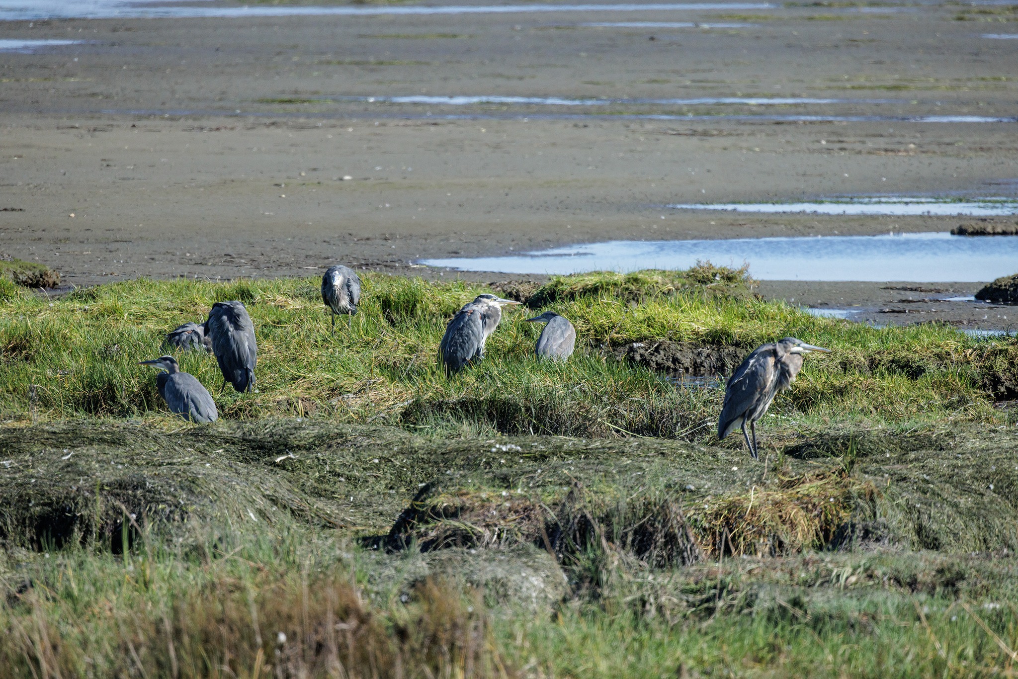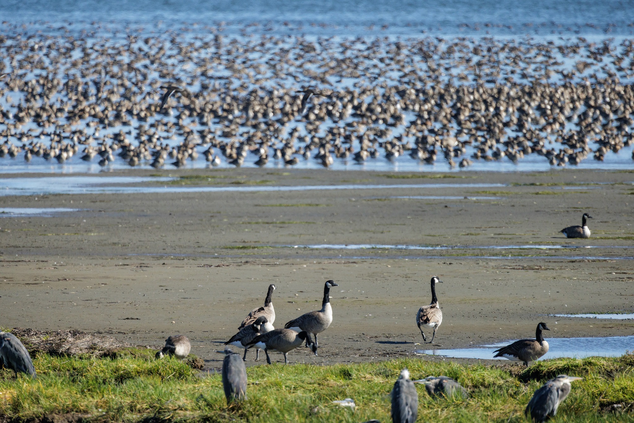 寬廣的潮間帶,除了各種岸鳥(Shorebird)與野鴨,還有隨時要獵捕他們的遊隼(Peregrine)、貓頭鷹(Owl),白頭海鵰(Bald Eagle)、灰澤鵟(Northern Harrier),正在附近的樹梢虎視眈眈,準備飽食一餐。